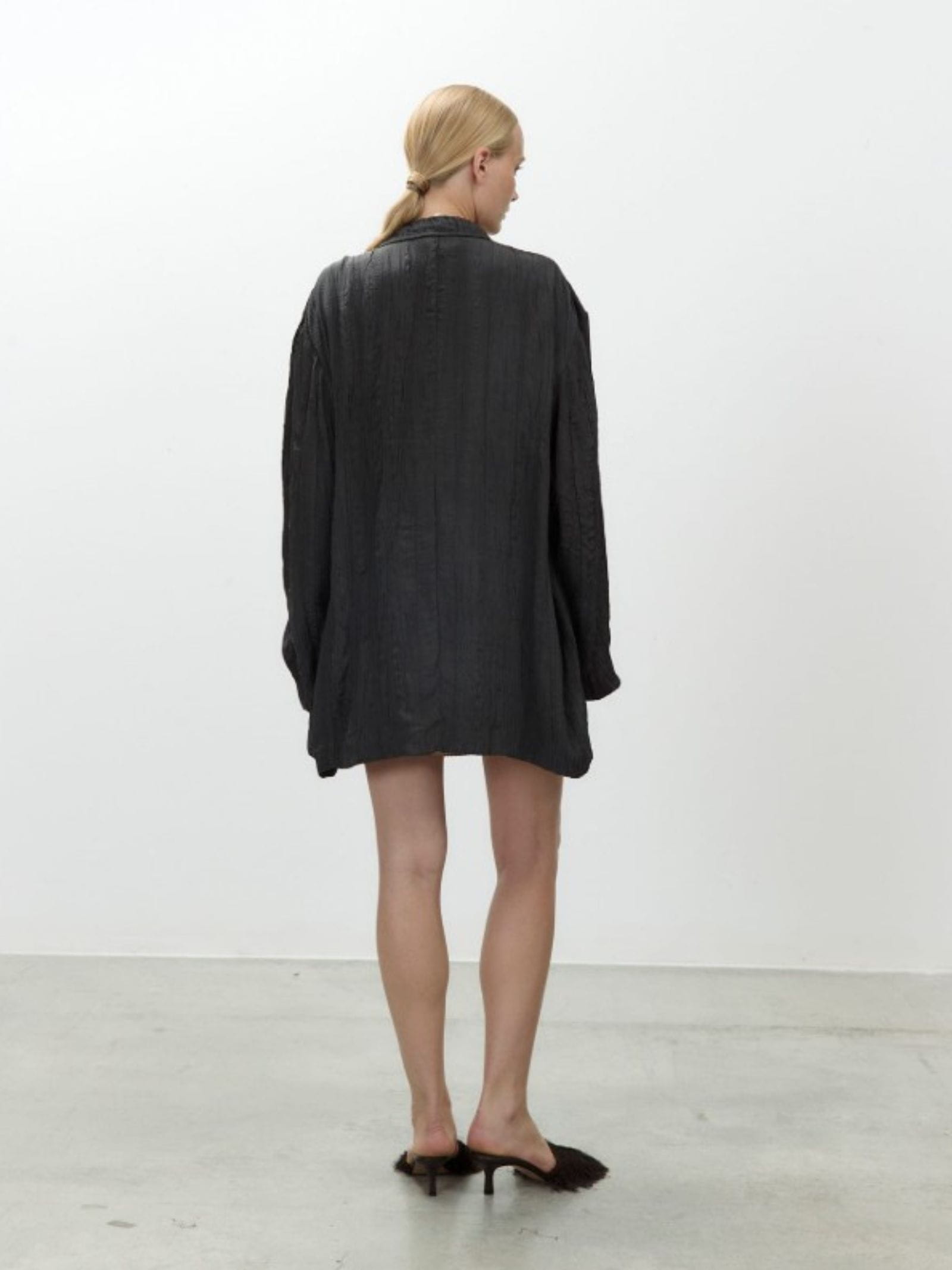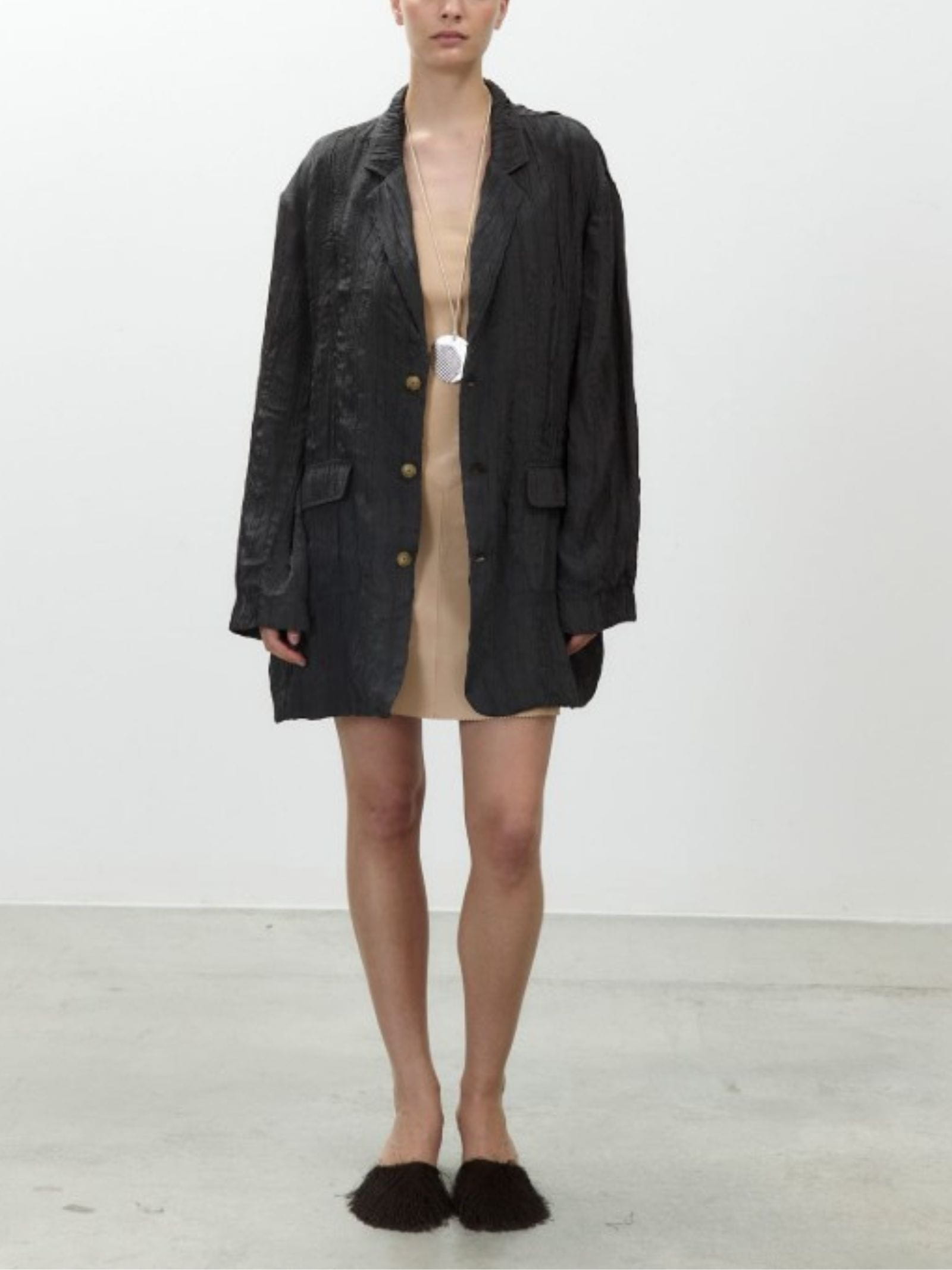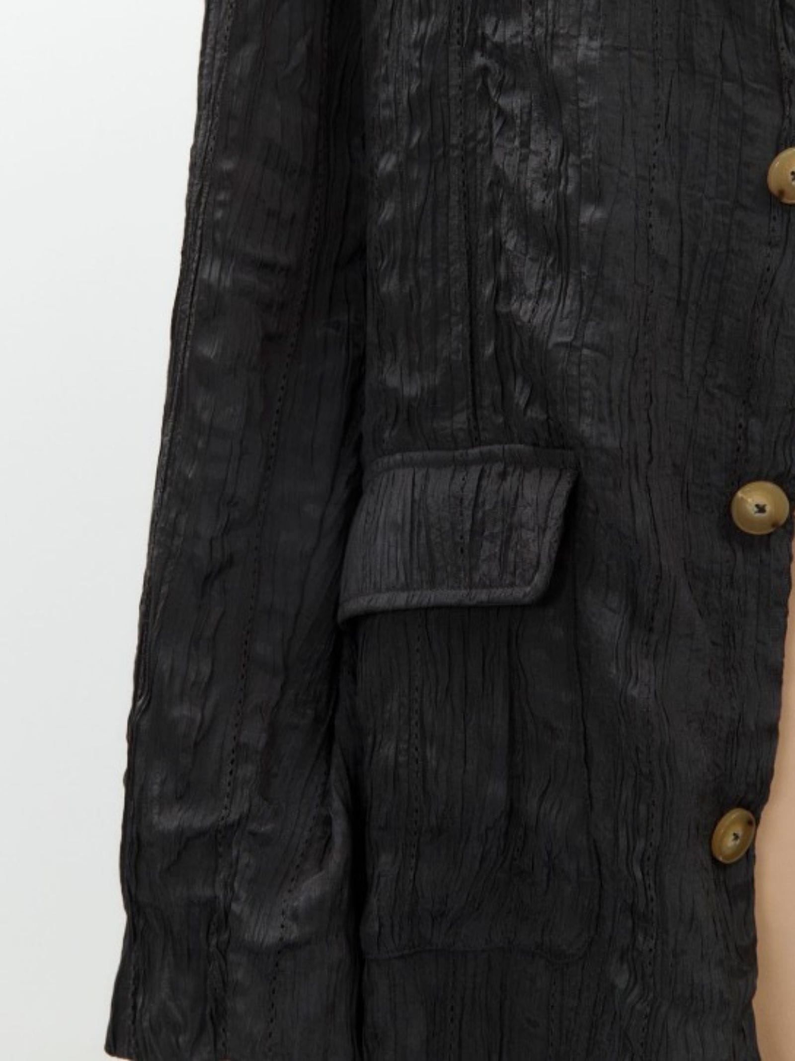 Giacca monopetto in viscosa, effetto stropicciato realizzato a mano, tasche applicate sul davanti, rever classico e chiusura frontale con bottoni.
