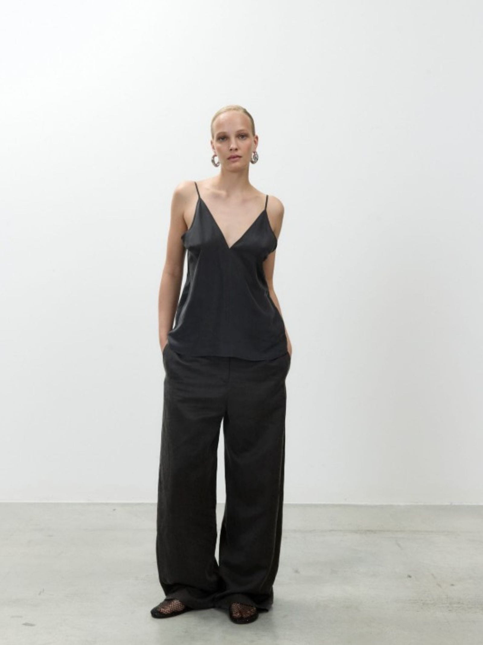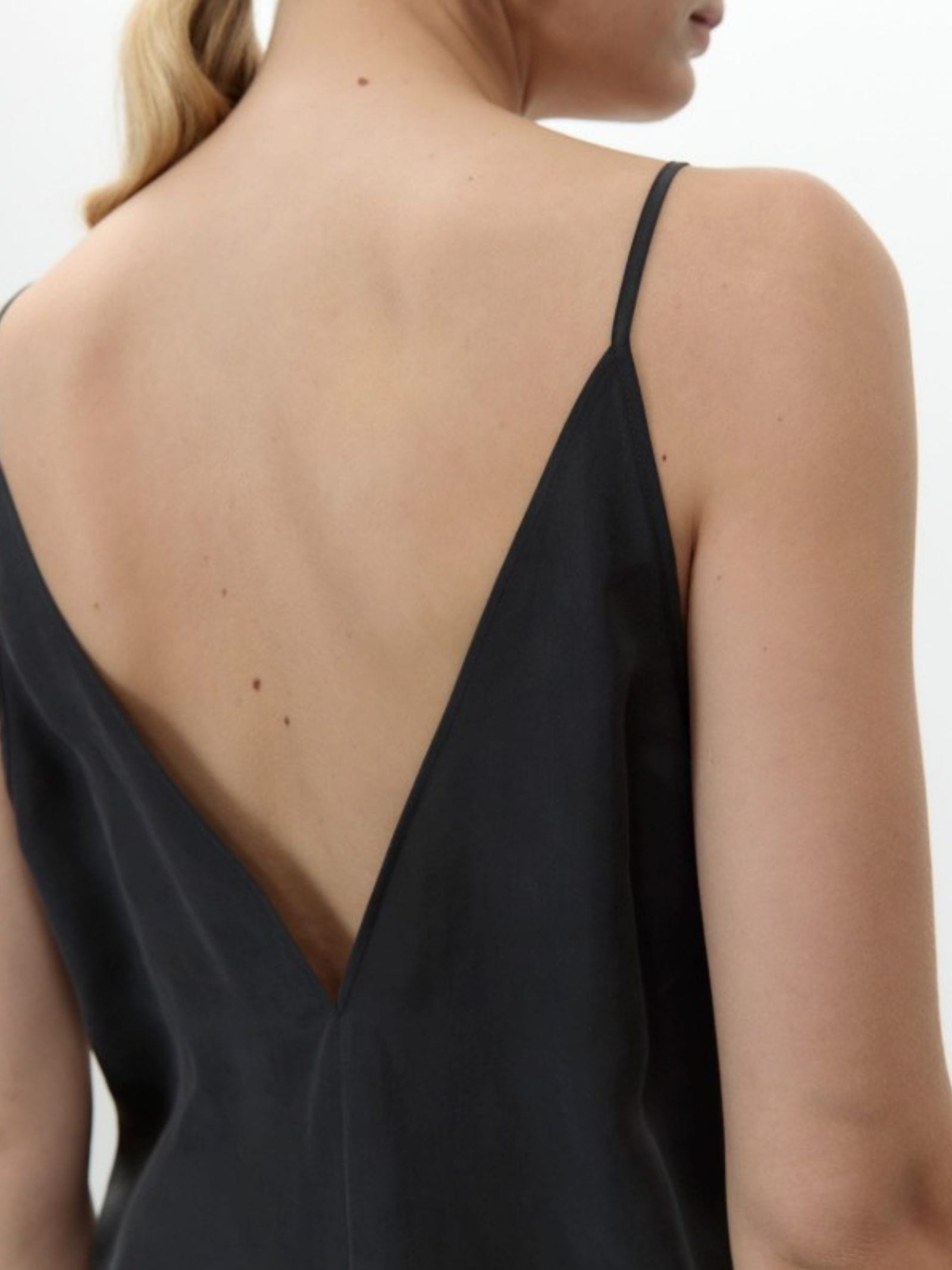 Top in seta, scollo a V sul davanti e sul retro, spalline sottili, fit regolare.