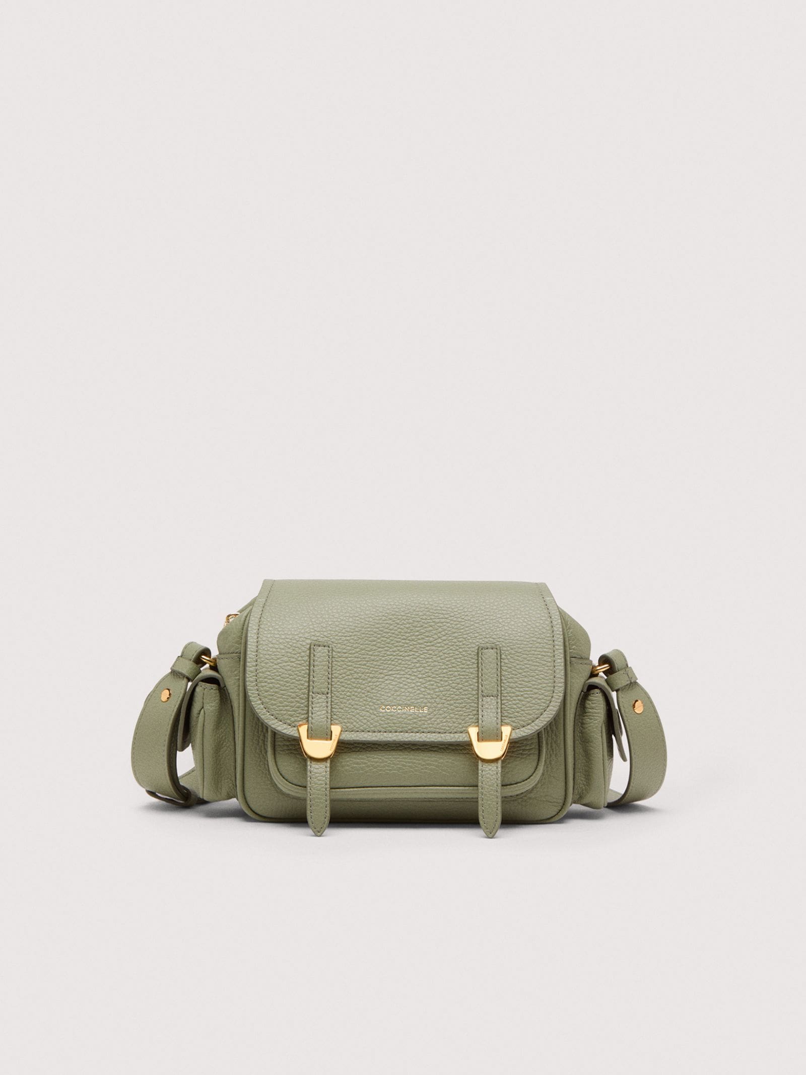 Borsa in pelle con tracolla regolabile e removibile, chiusura con zip e magneti sulla patta, due tasche interne e due scomparti, logo oro.