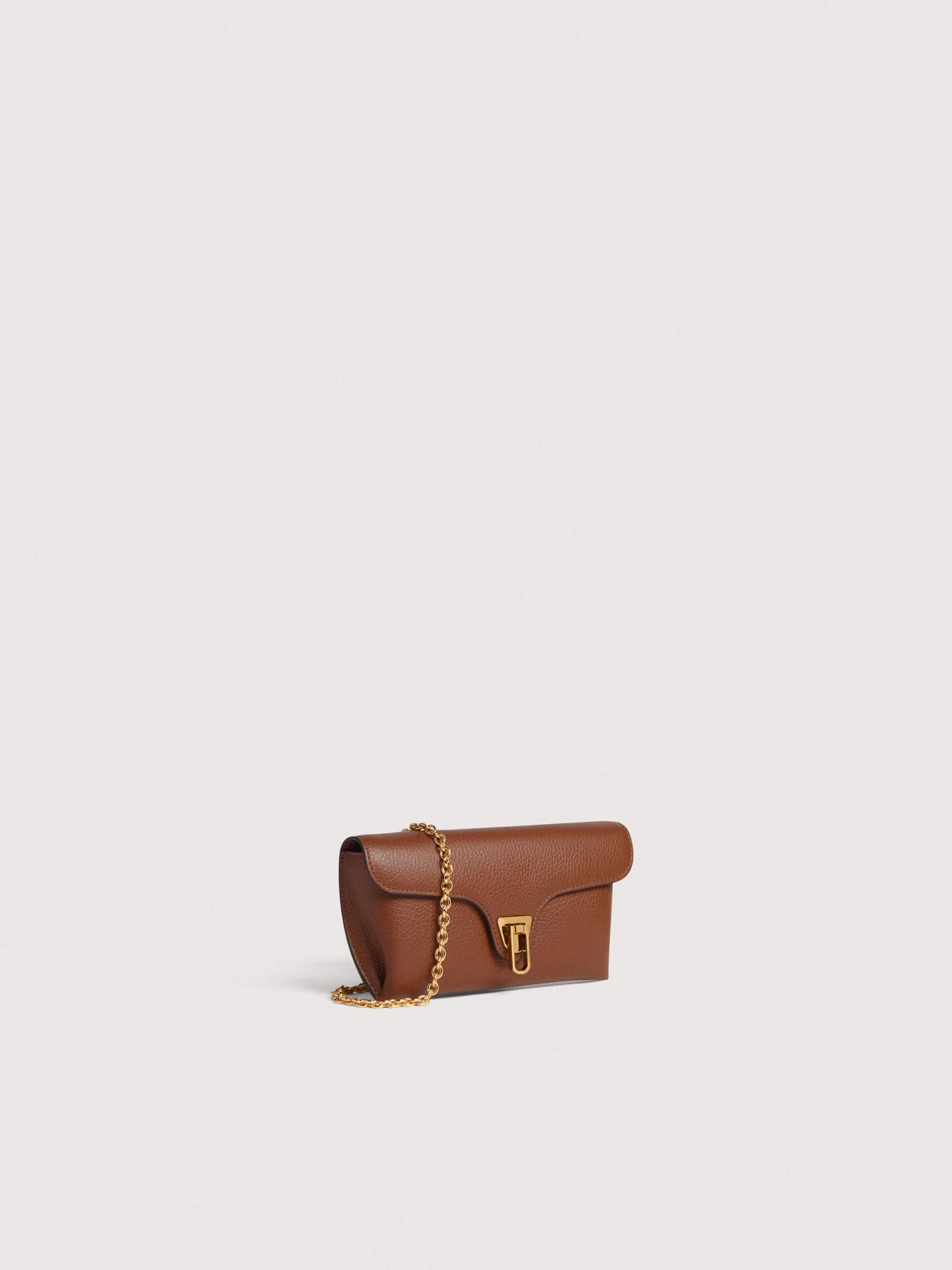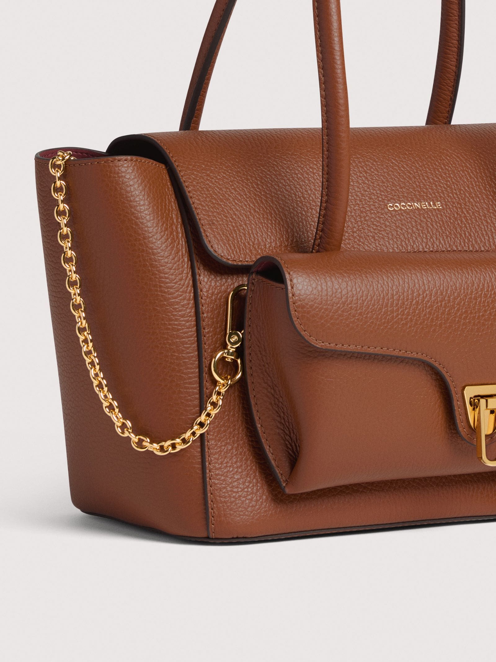 Borsa in pelle, chiusura con magneti, tracolla regolabile e removibile, tasca frontale Beat removibile con catena per portabilità a spalla, due tasche interne, logo oro.
