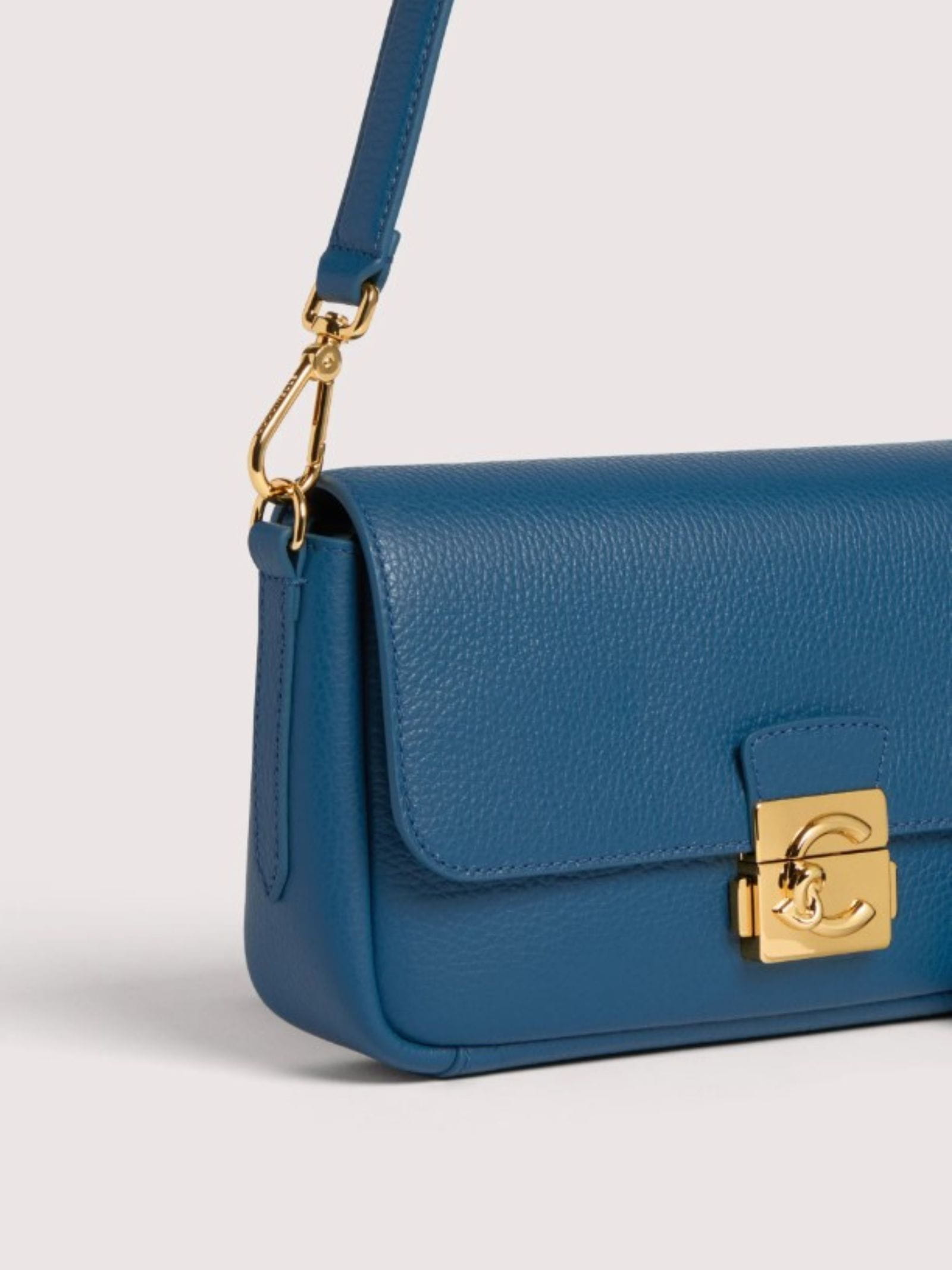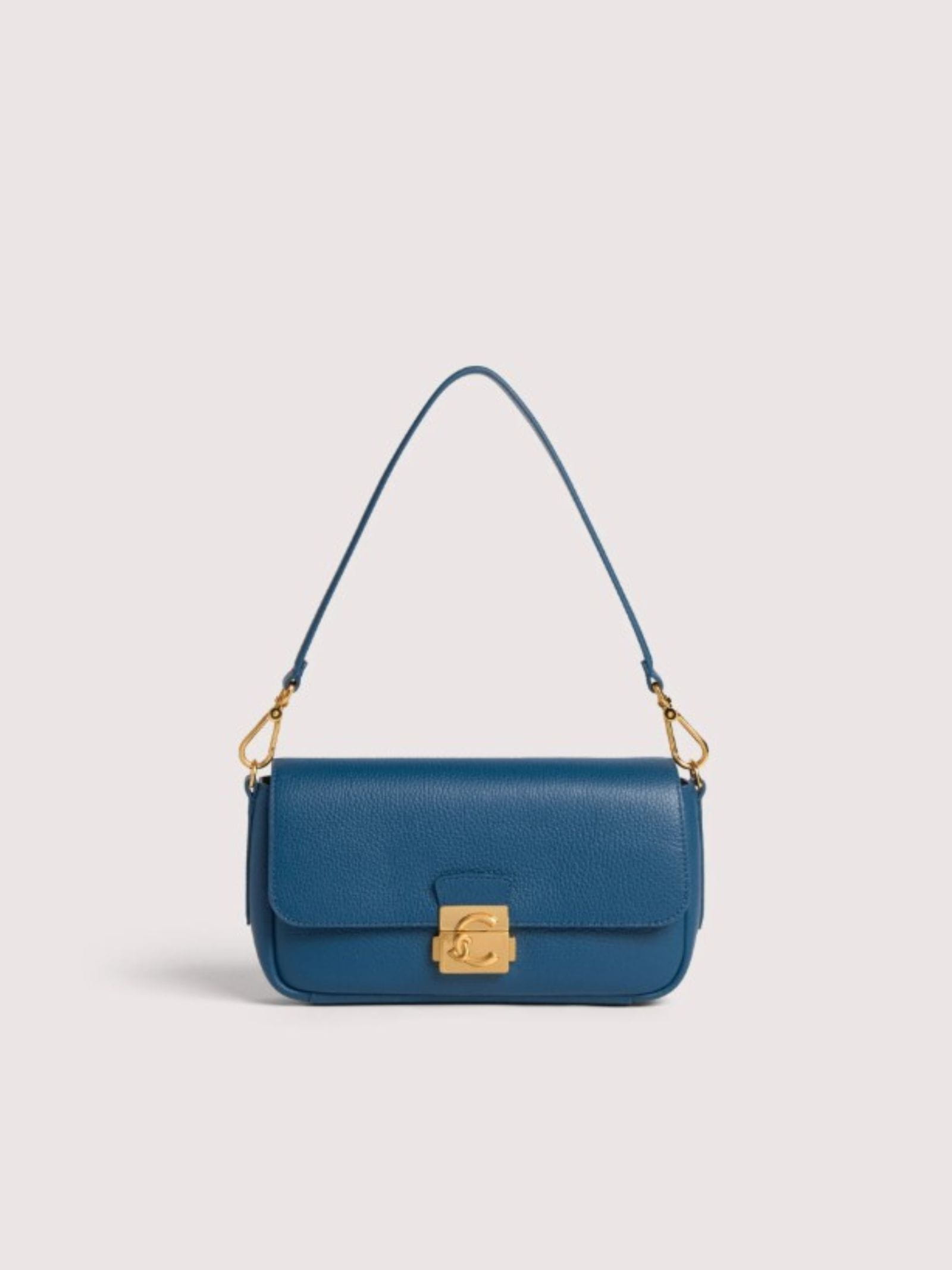 Borsa in pelle, manico removibile, tracolla removibile e regolabile, chiusura con pulsanti laterali.