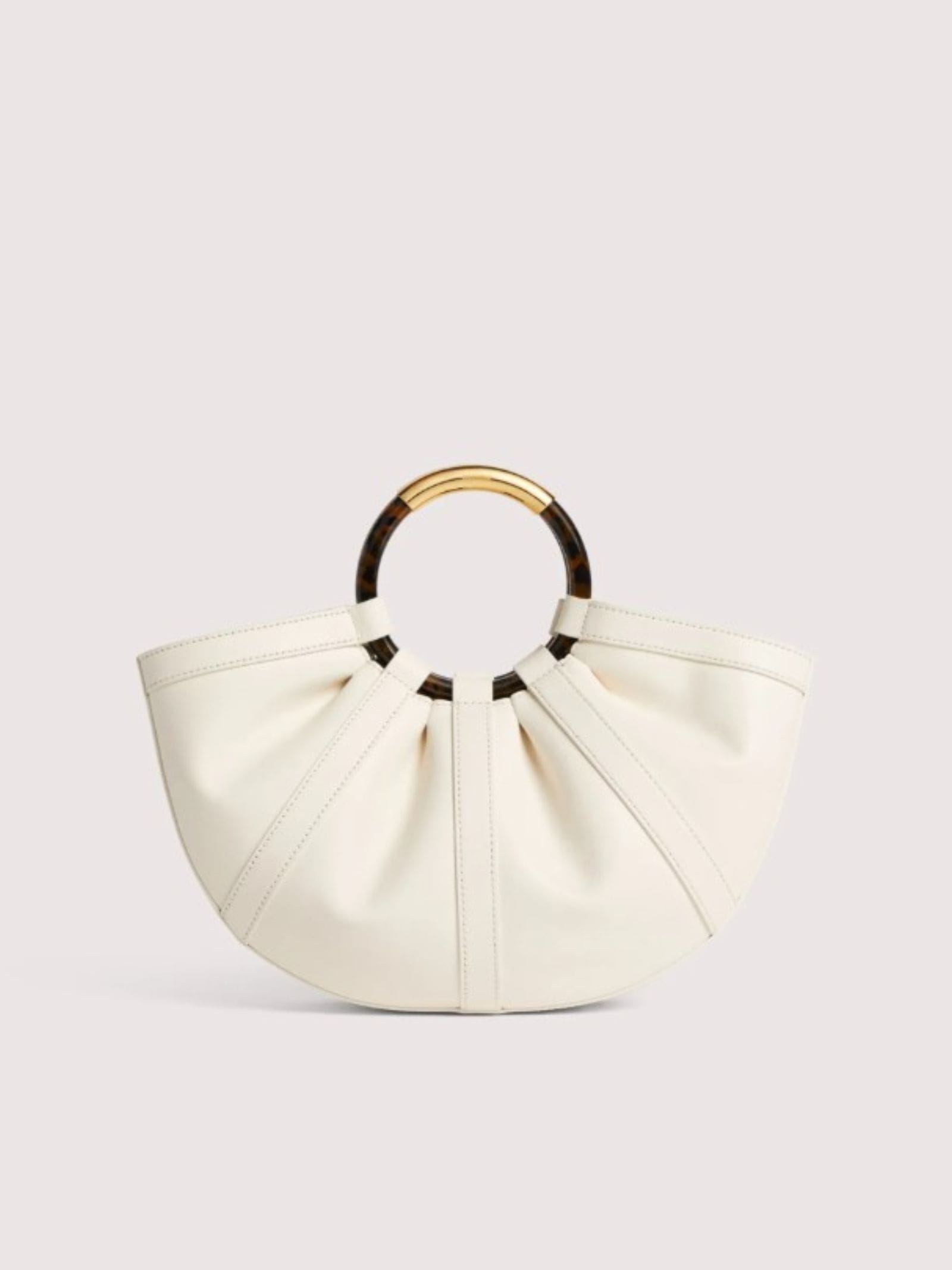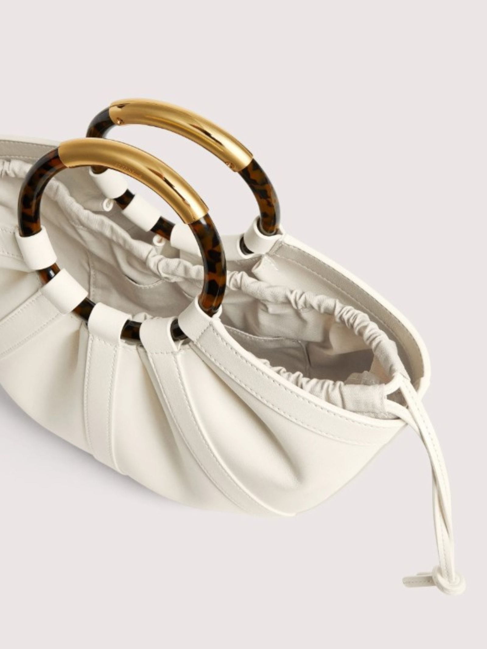 Borsa in pelle liscia, forma a mezza luna, chiusura con bottone, doppio manico in plexiglass effetto tartaruga, tracolla regolabile e removibile, pouch interna in cotone estraibile con coulisse.