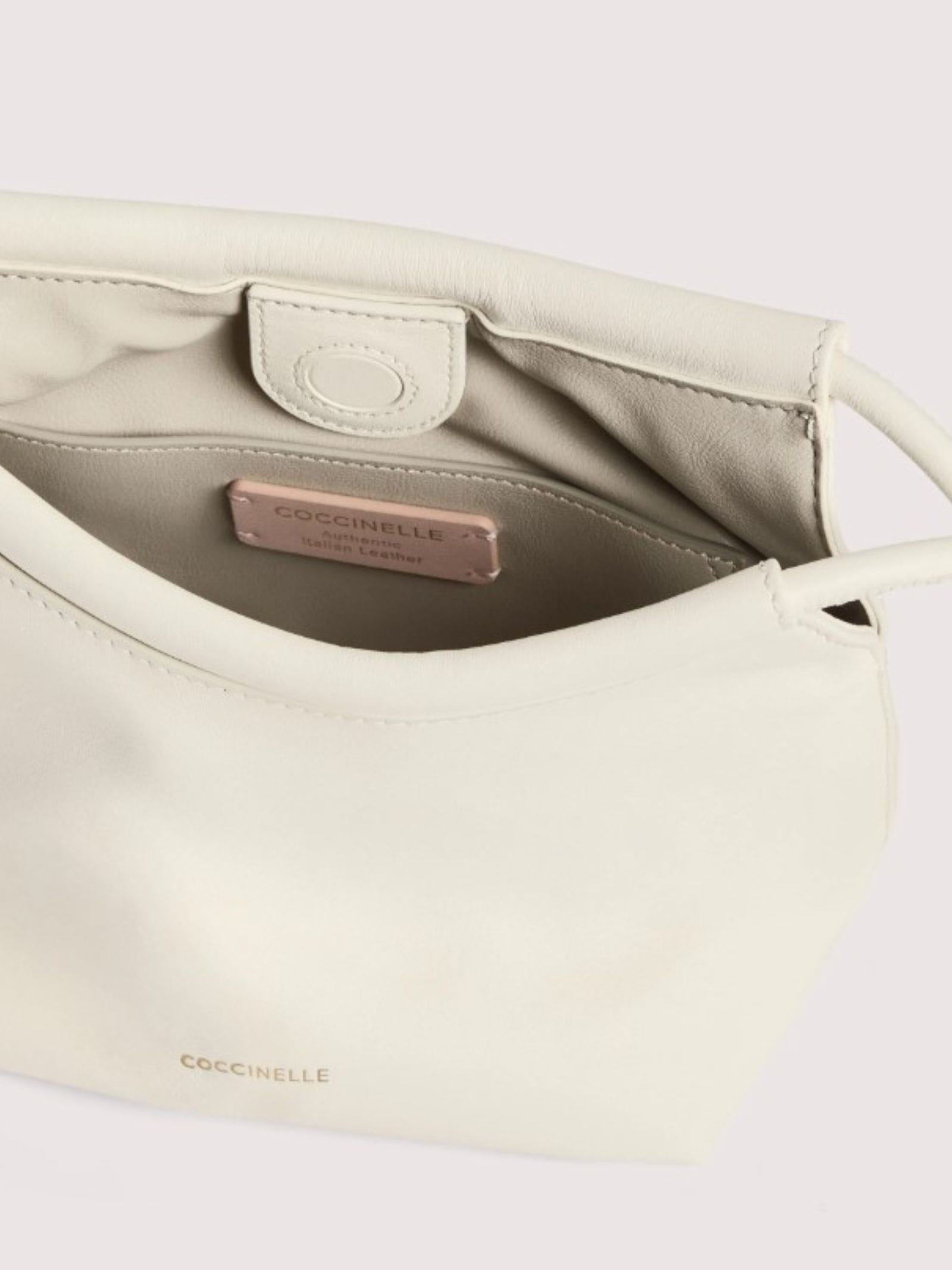 Borsa in pelle liscia, chiusura con magnete, pensata per essere indossata al polso come un bracciale, la caratteristica è il dettaglio tubolare di pelle che si infila nell'elemento circolare di metallo chiudendo la borsa.