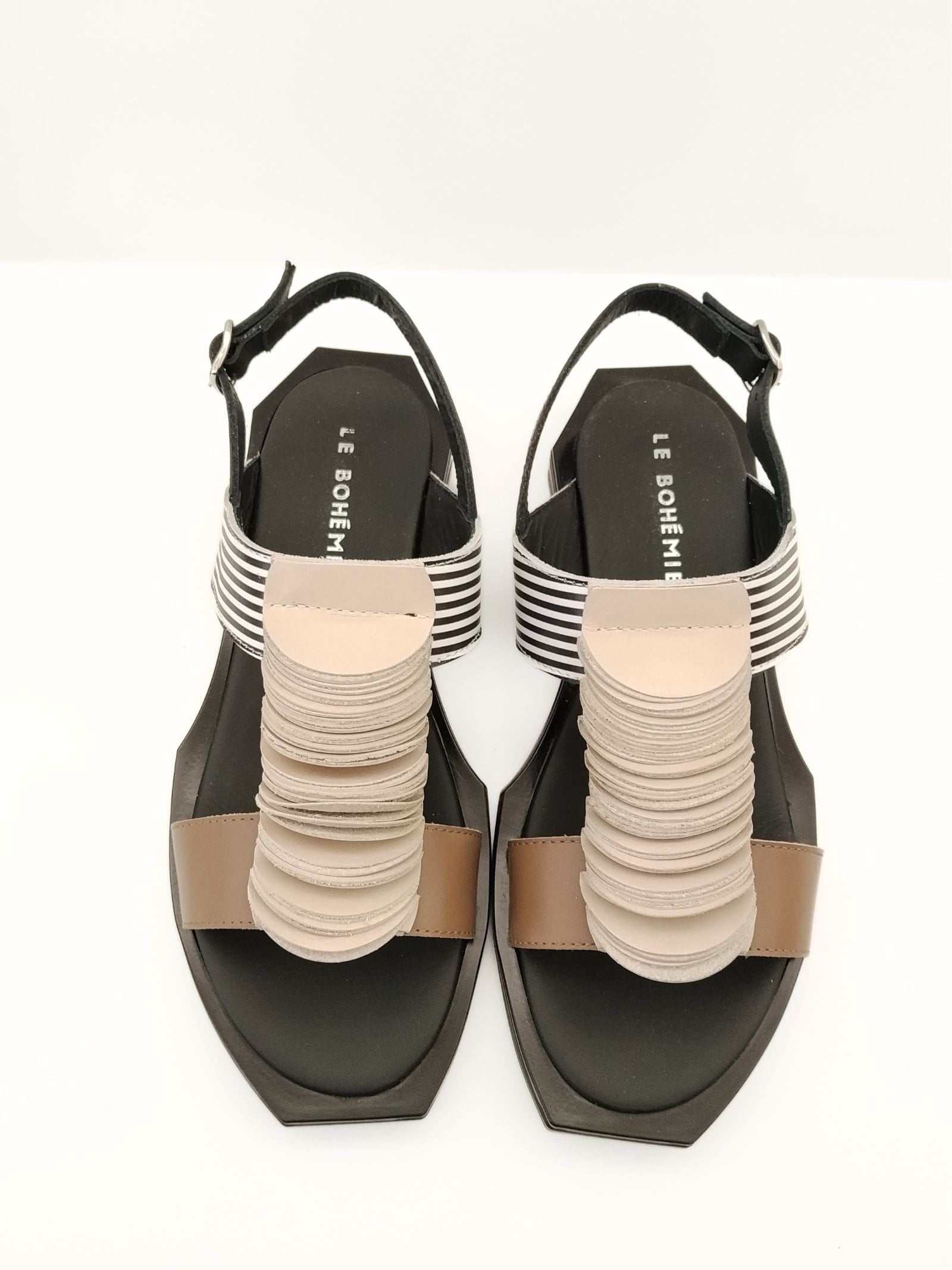 Sandali in pelle, dettagli in bianco e nero, dettaglio di ruches a volee in pelle, cinturino regolabile, suola interna in pelle, suola in gomma con particolare struttura geometrica caratteristica del brand. Made in Italy.