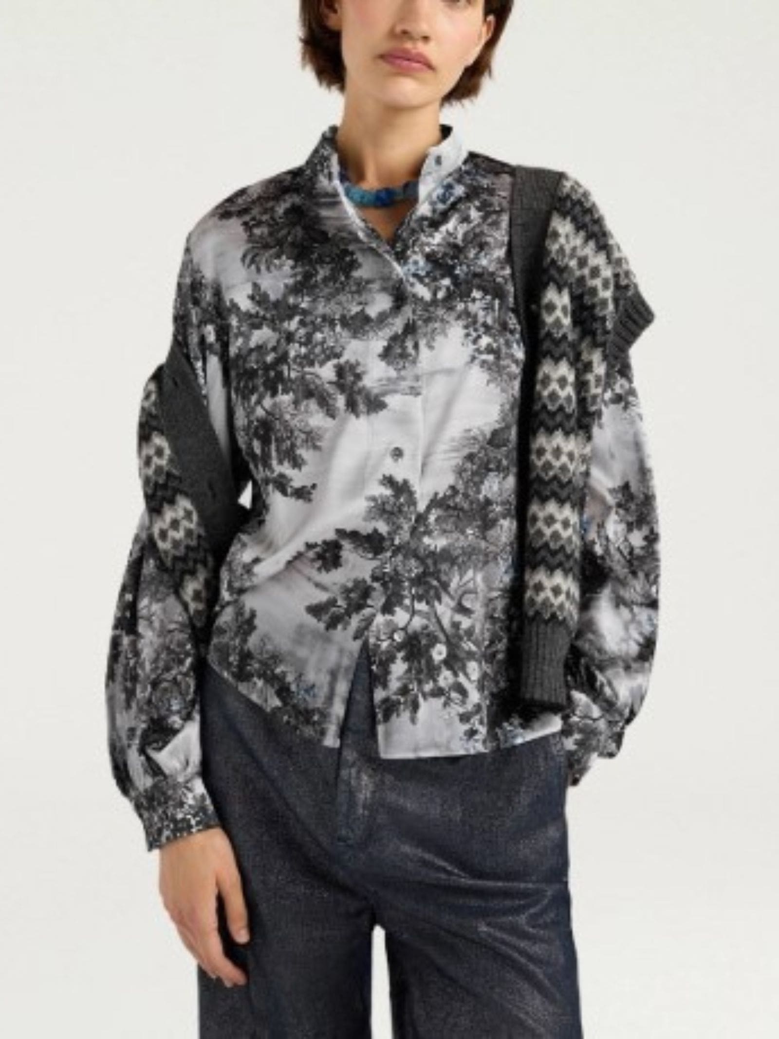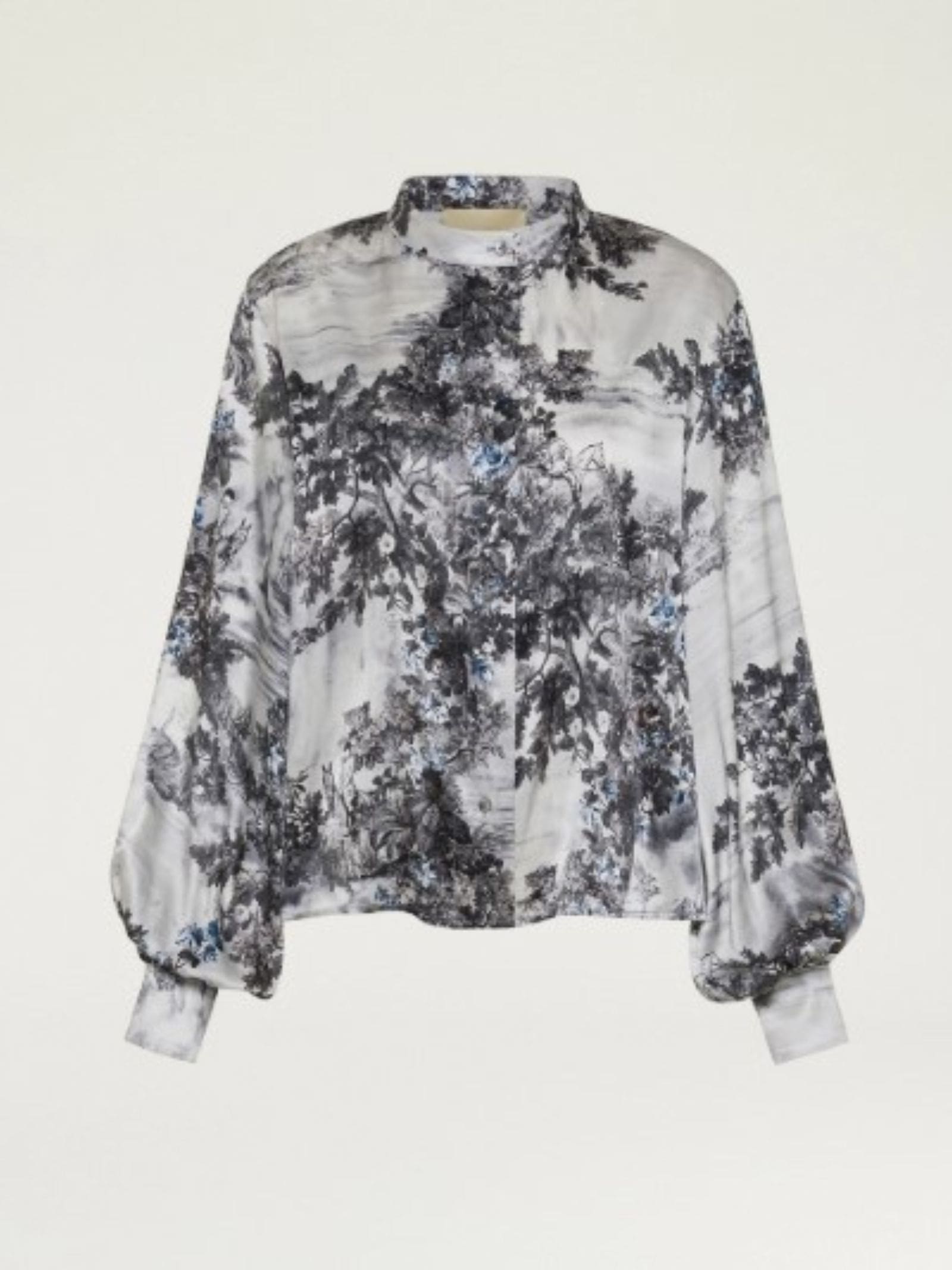 Camicia in raso stretch di pura seta stampata, maniche arricciate, collo alla coreana, bottoni in vera madreperla.
