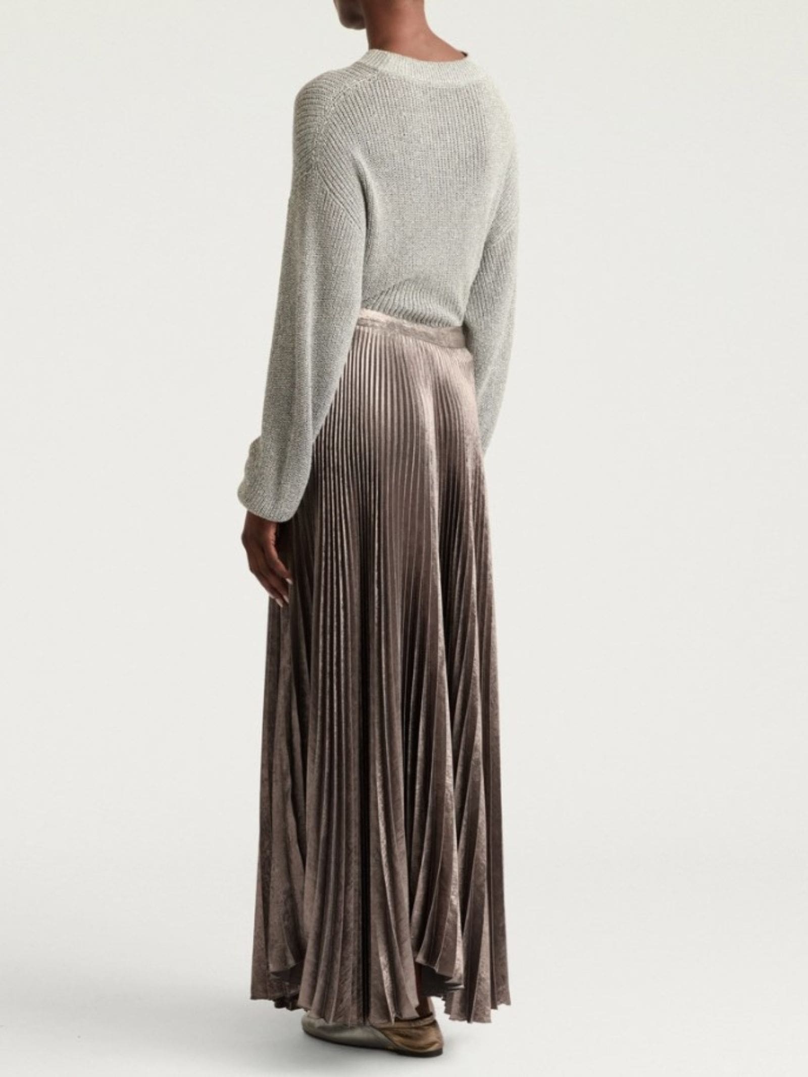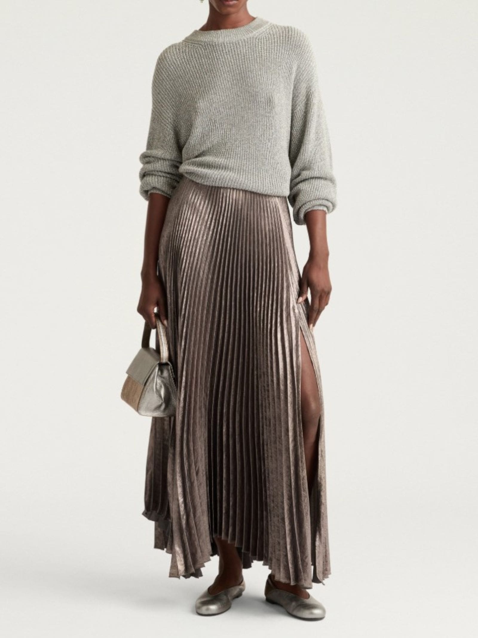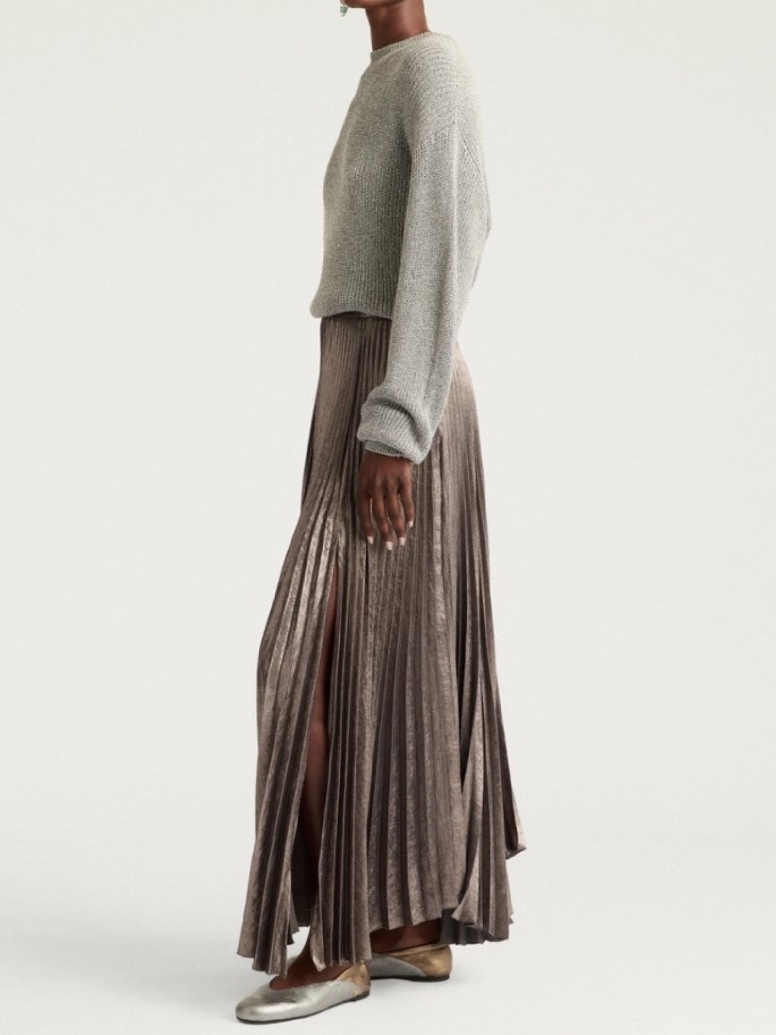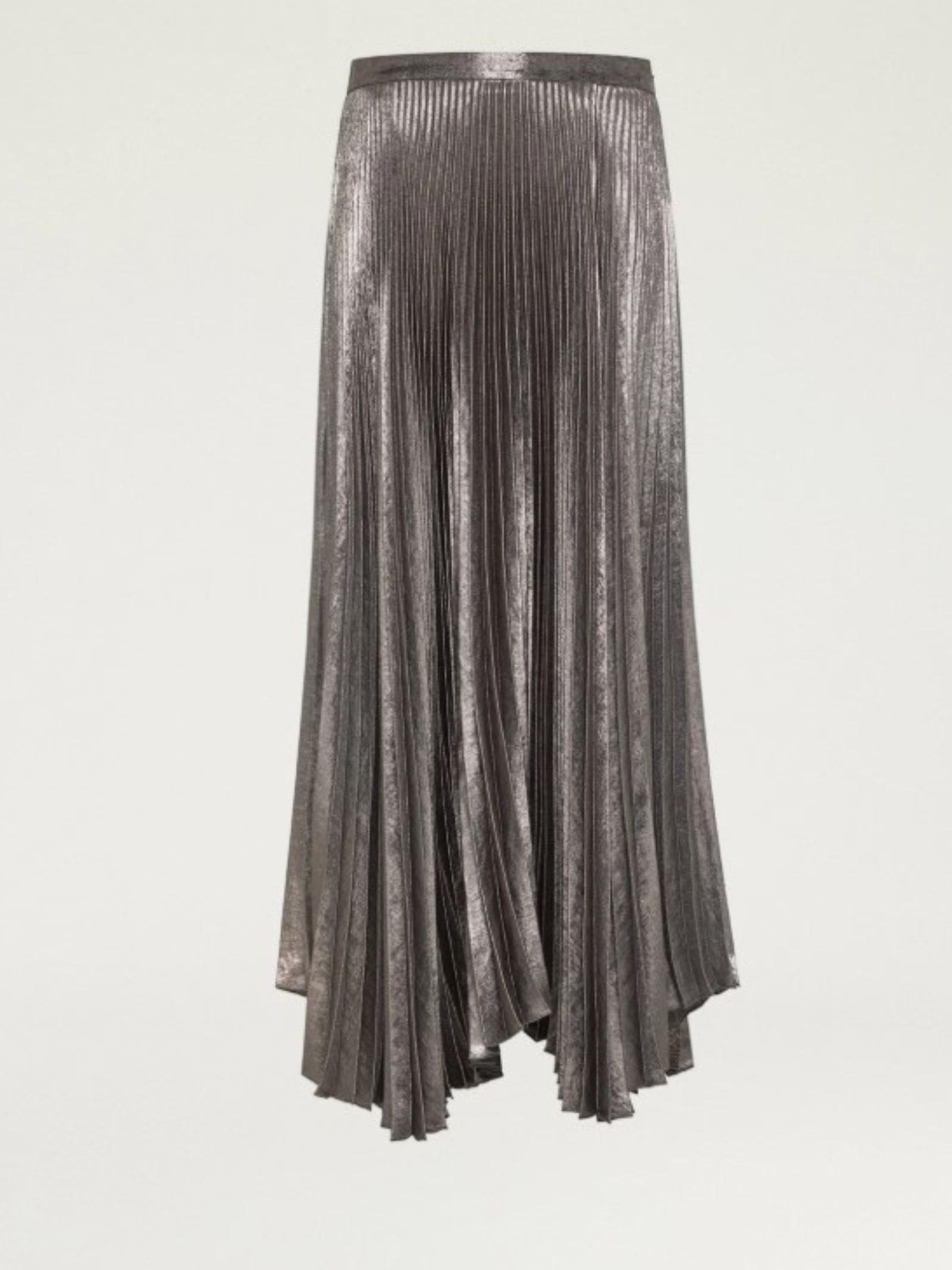 Gonna plissettata in tessuto laminato, spacco asimmetrico sul davanti, cinturino in vita.