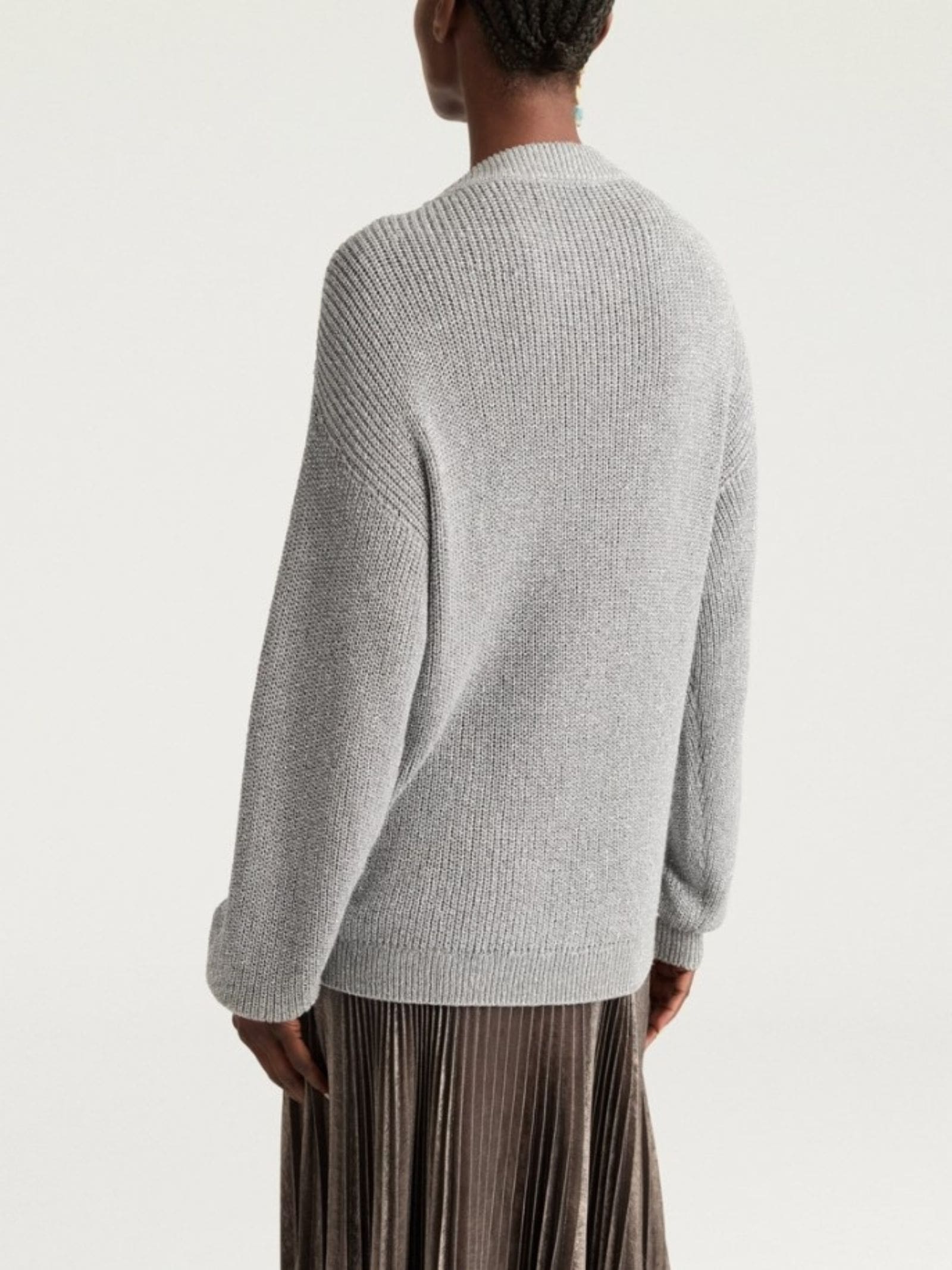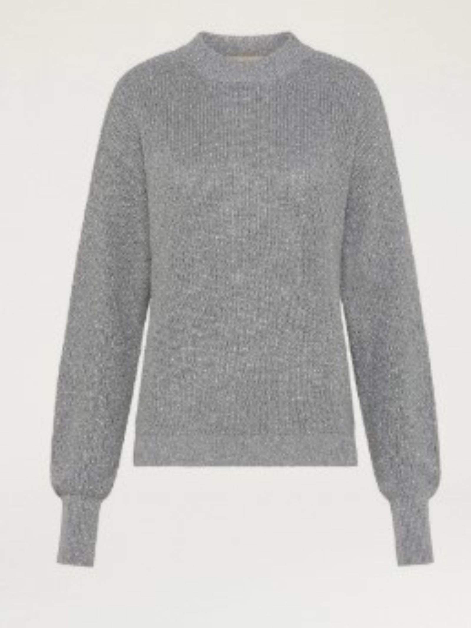 Maglia in viscosa con lurex metallizato, girocollo arrampicato in costina, manica sagomata con polso alto in costina.