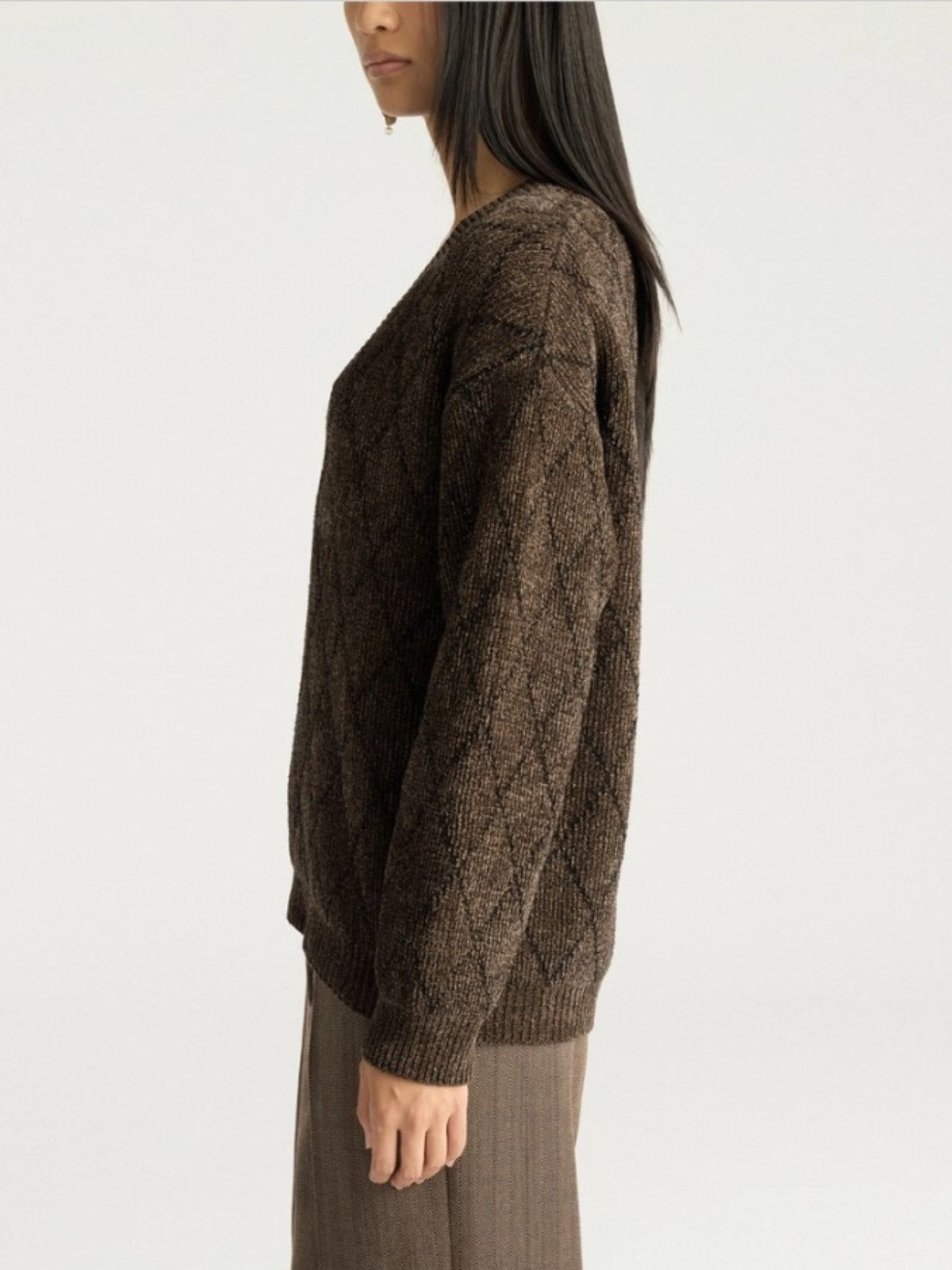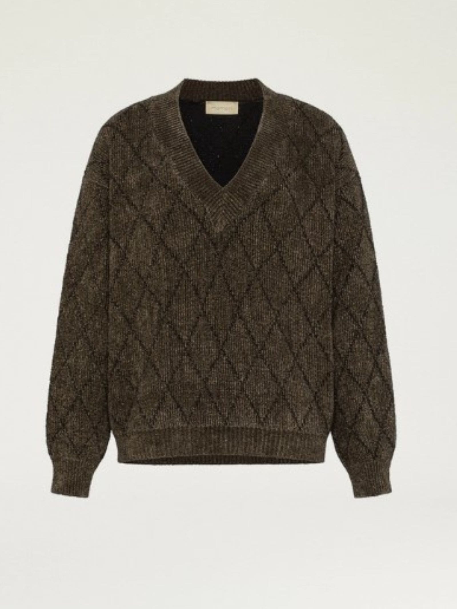 Maglia a rombi jaquard in lurex e ciniglia, ampio scollo a V, coste sullo scollo e sui fondi a contrasto.