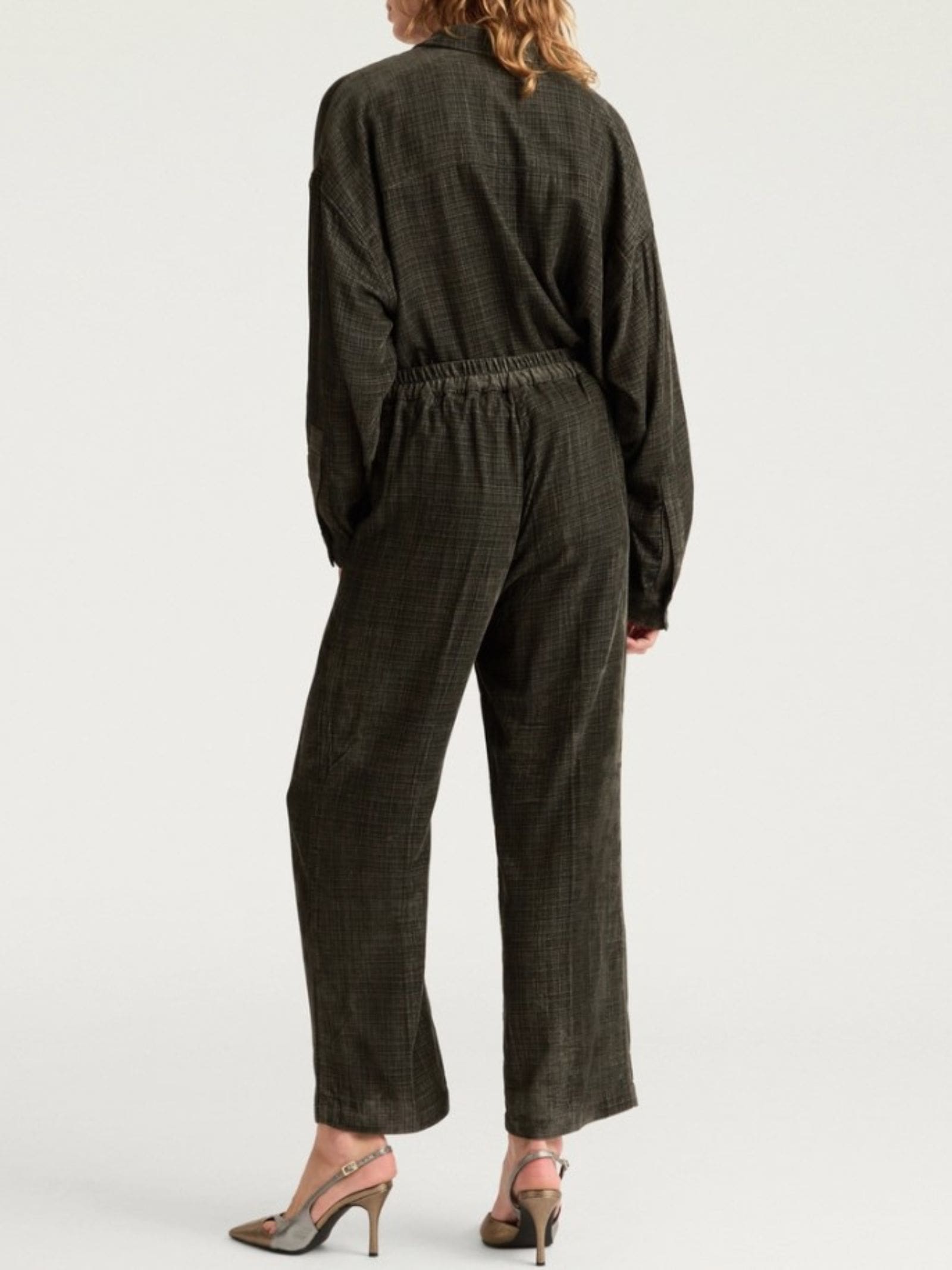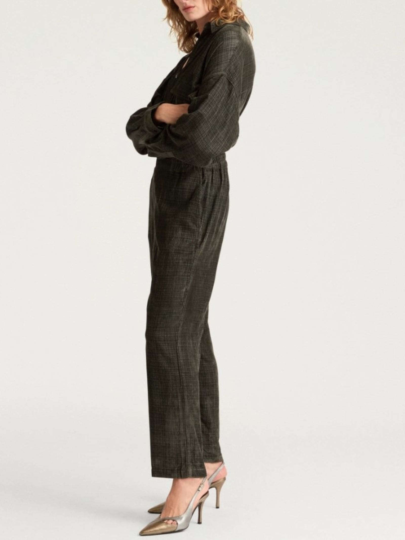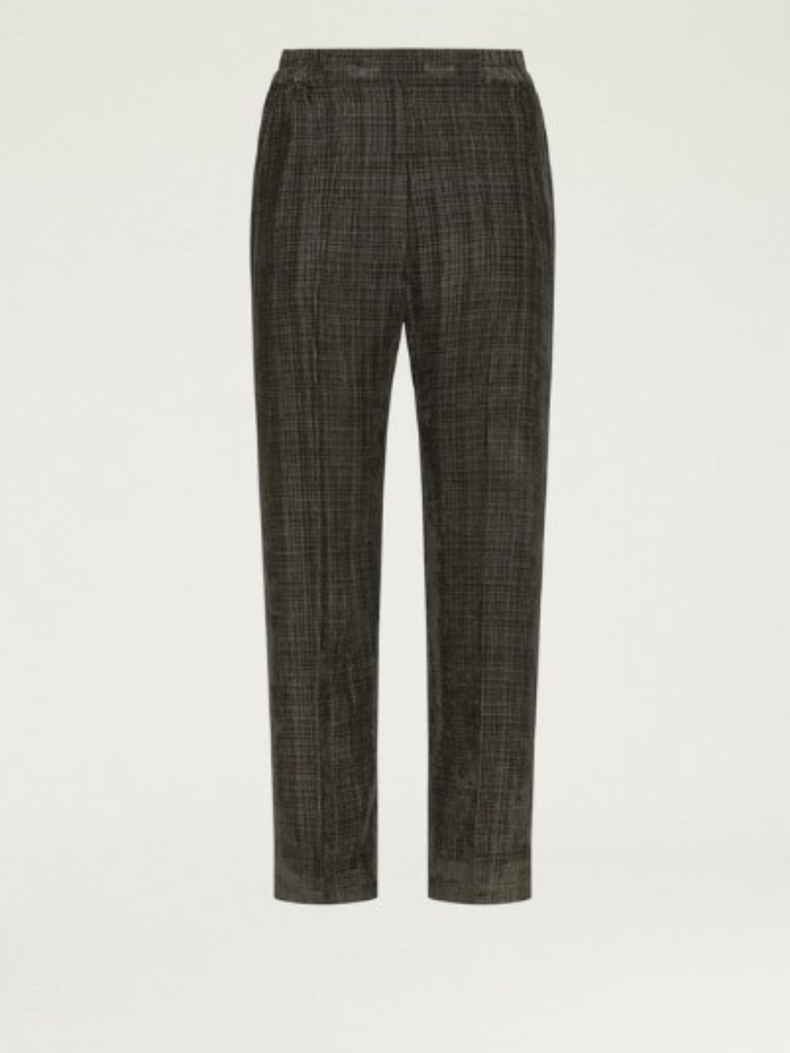 Pantalone in tessuto millerighe, cinturino in vita ed elastico sul retro, tasche alla francese, gambaa dritta regolare.