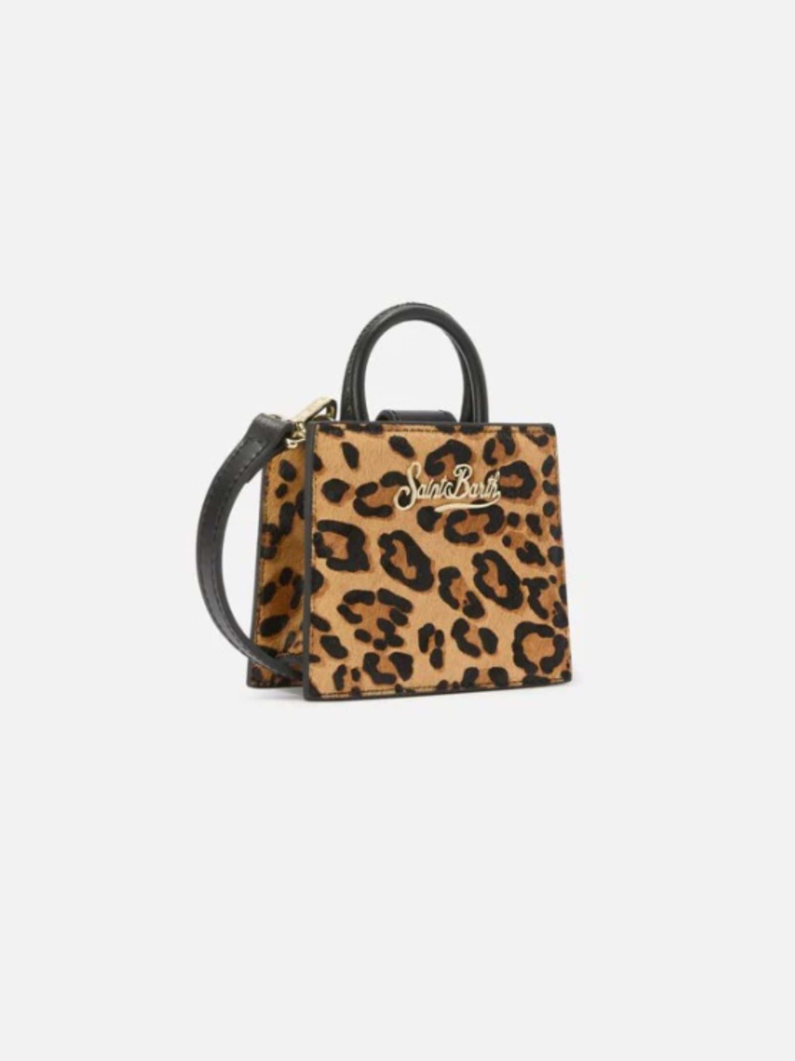 M icro-bag in pelle e cavallino leopardato, tracolla removibile e regolabile, chiusura con calamita, placchetta con logo.