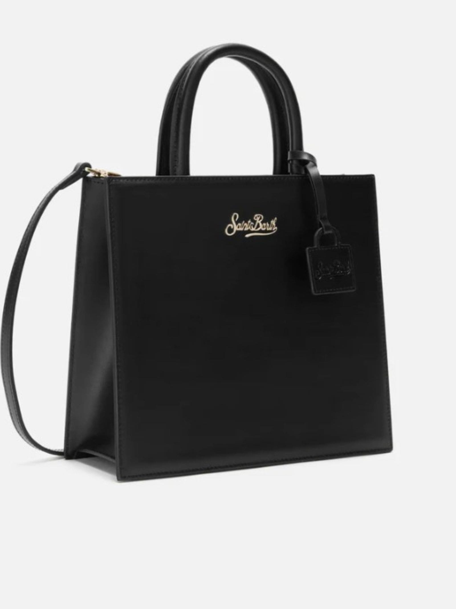 Borsa in pelle liscia, pattina con chiusura magnetica, logo in metallo, tracolla in pelle regolabile e removibile, interno foderato in cotone e con taschino in pelle, charm in pelle con logo impresso agganciato al manico.