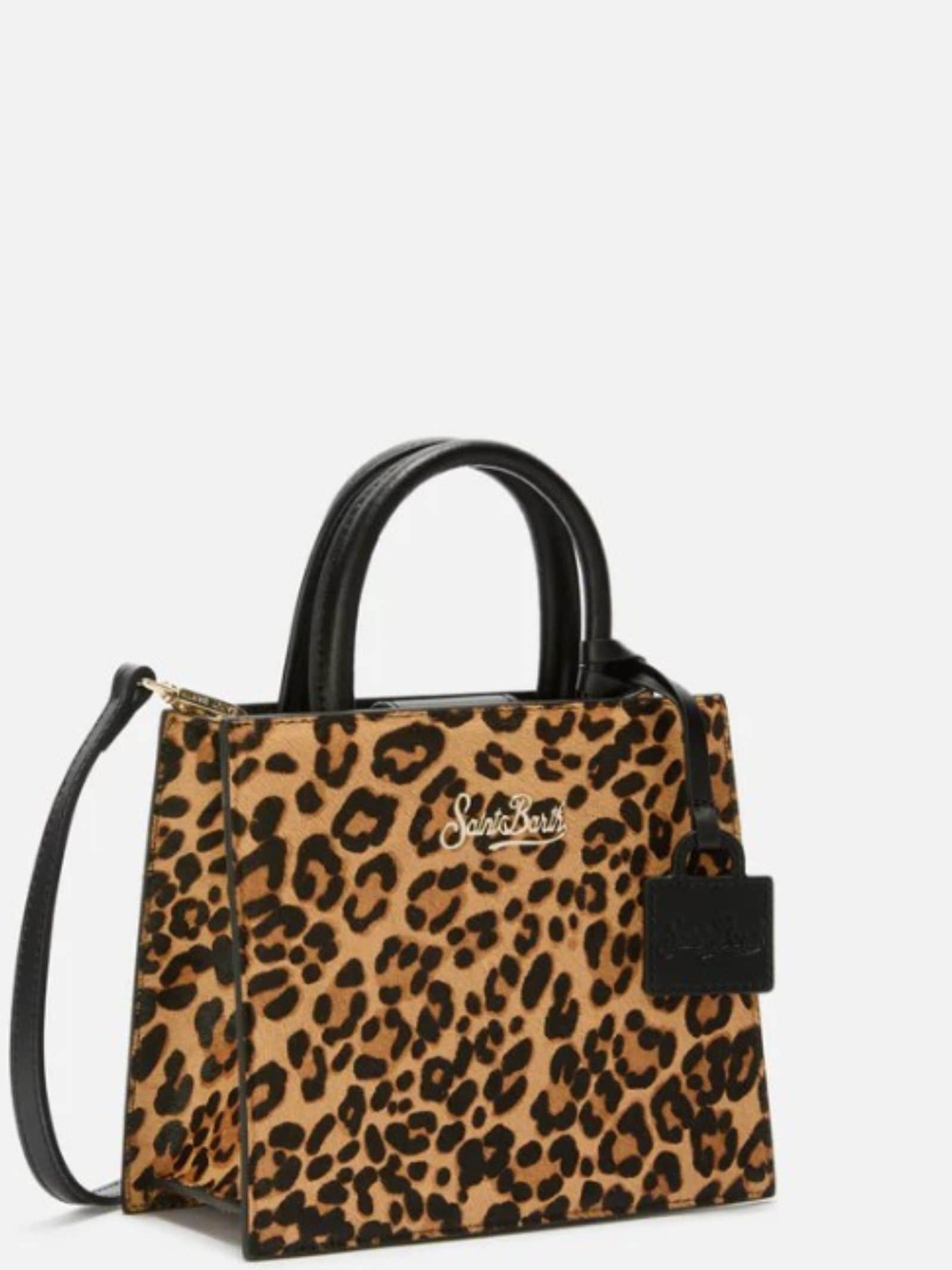 Borsa in pelle e cavallino stampa animalier, pattina con chiusura magnetica, logo in metallo, tracolla in pelle liscia nera regolabile e removibile, interno foderato in cotone e con taschino in pelle, charm in pelle con logo impresso agganciato al manico.
