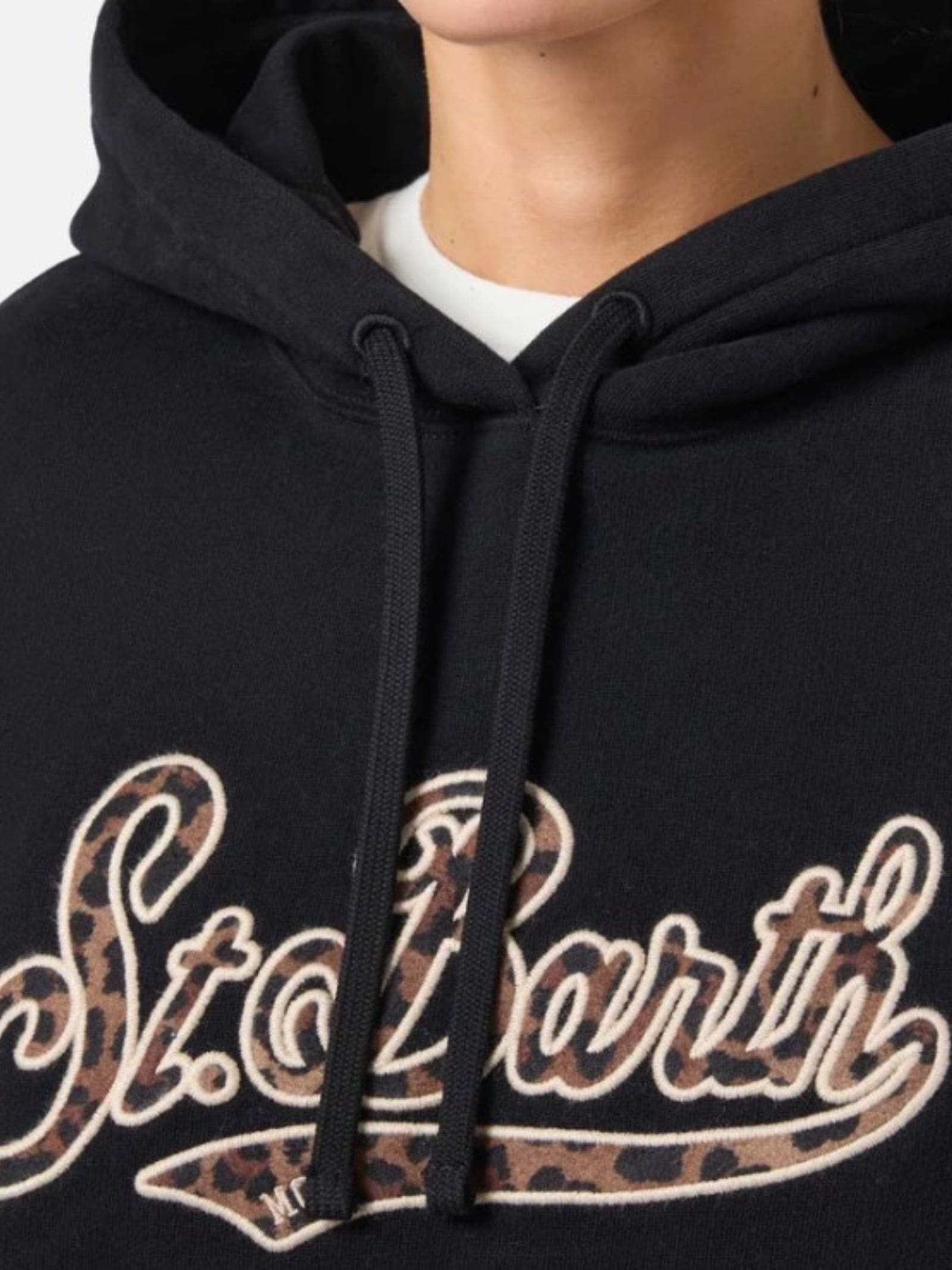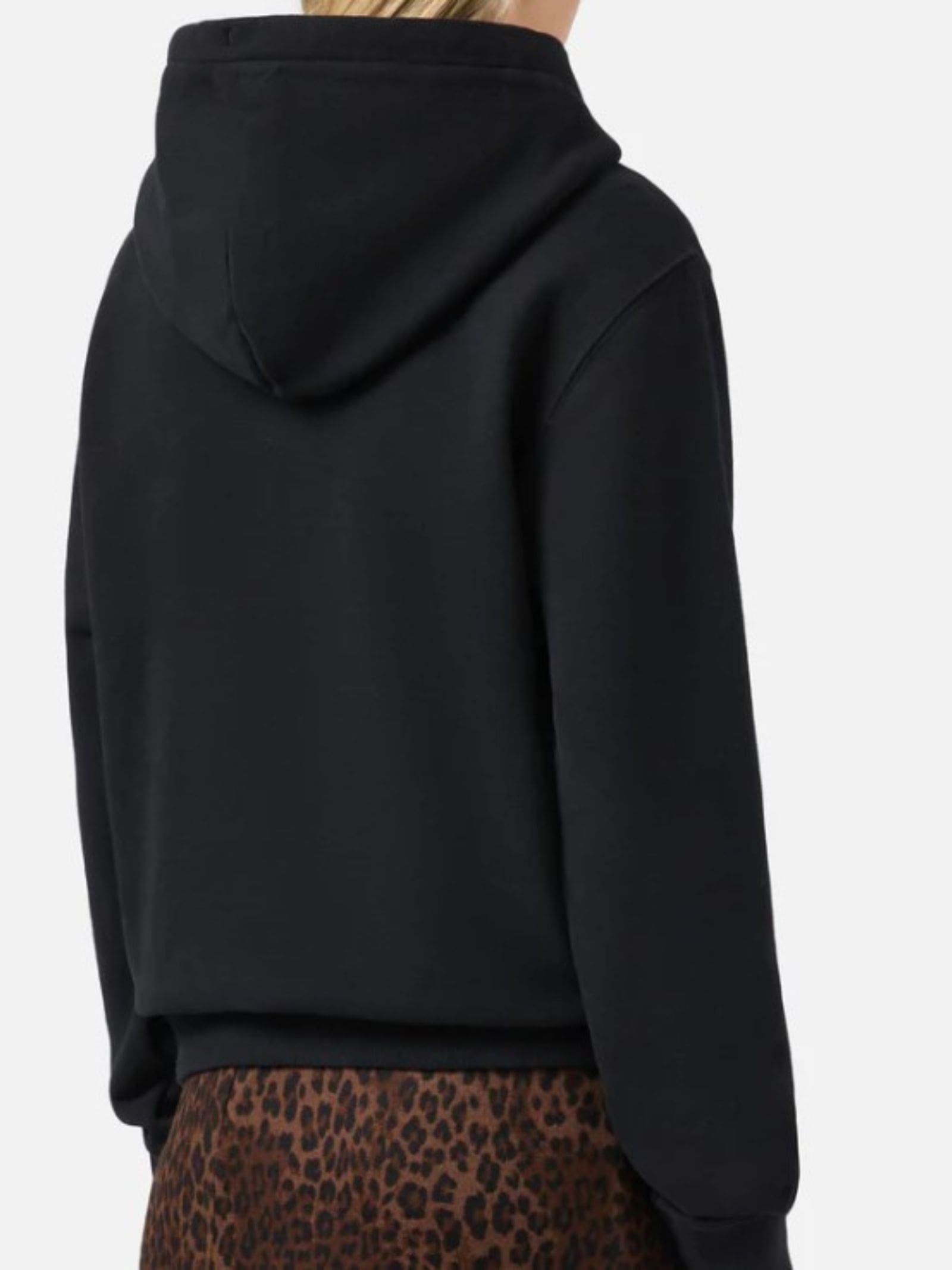 Felpa in cotone con ricamo patch del logo in velour a stampa leopardata, tasca a marsupio, cappuccio, costina abbinata.