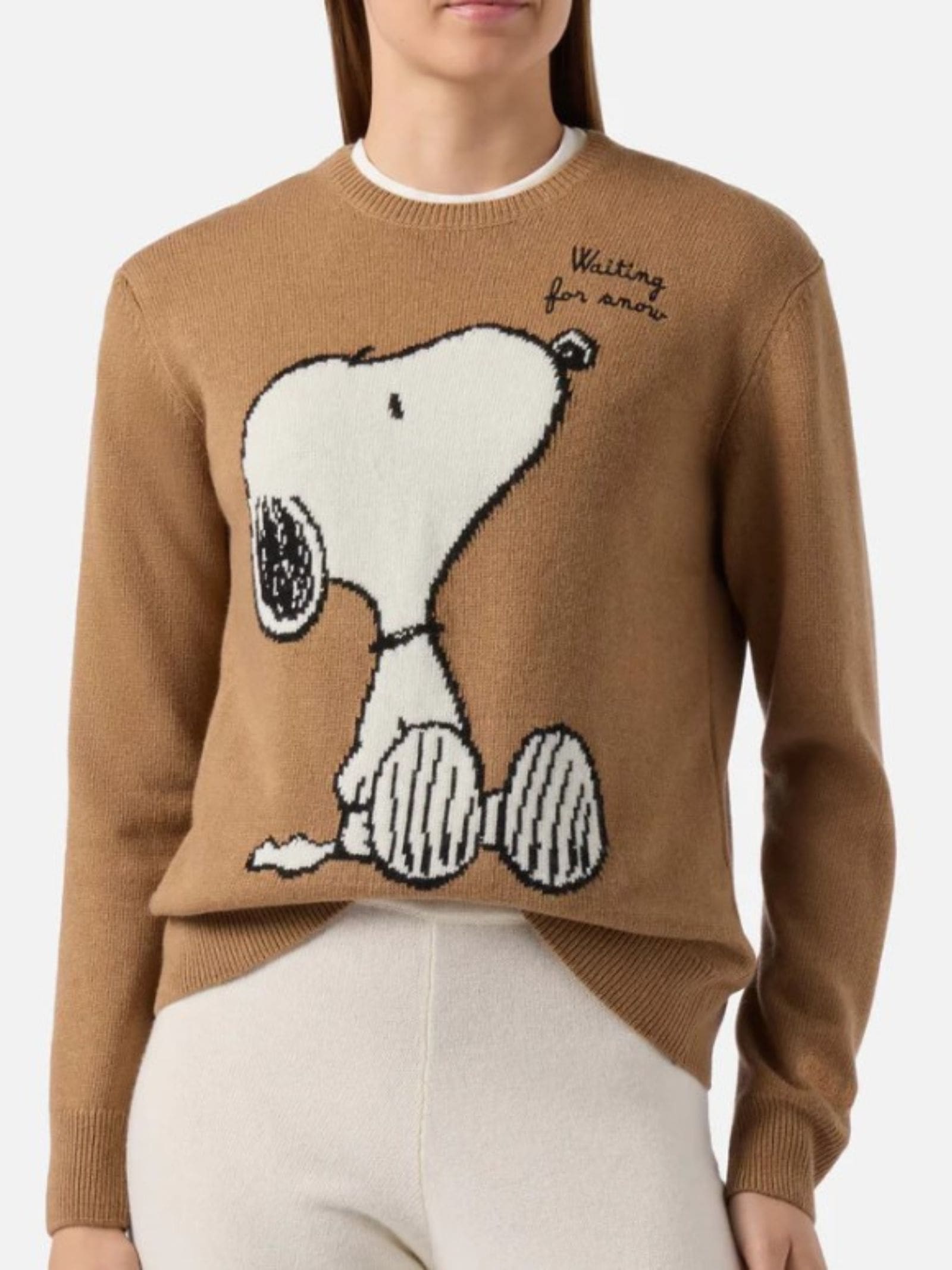 Maglia in misto cashmere con grafica jacquard di Snoopy e ricamo a contrasto, fondo, collo e polsi a coste.