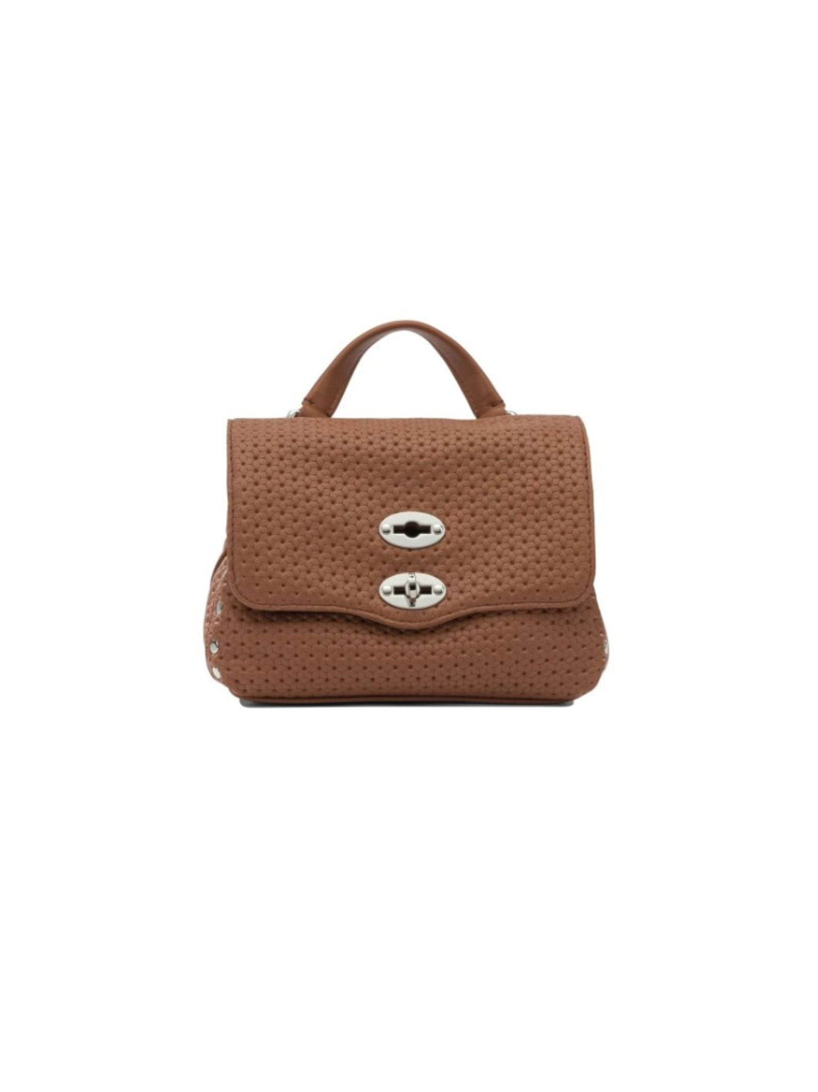 Postina nel formato baby in pelle effetto nido d'ape, interno in cotone, iconica doppia chiusura, tracolla regolabile e removibile.