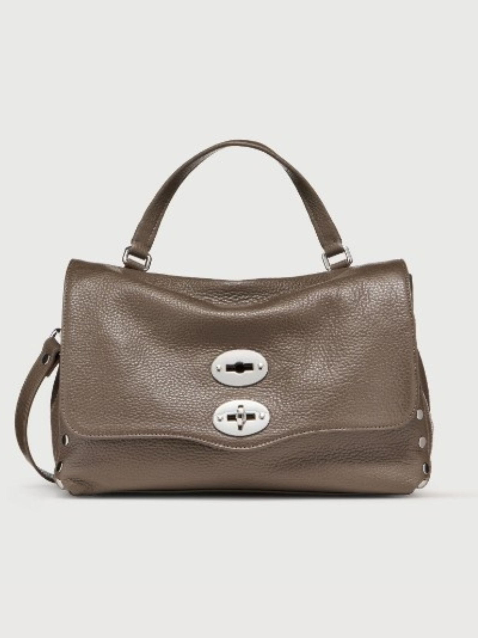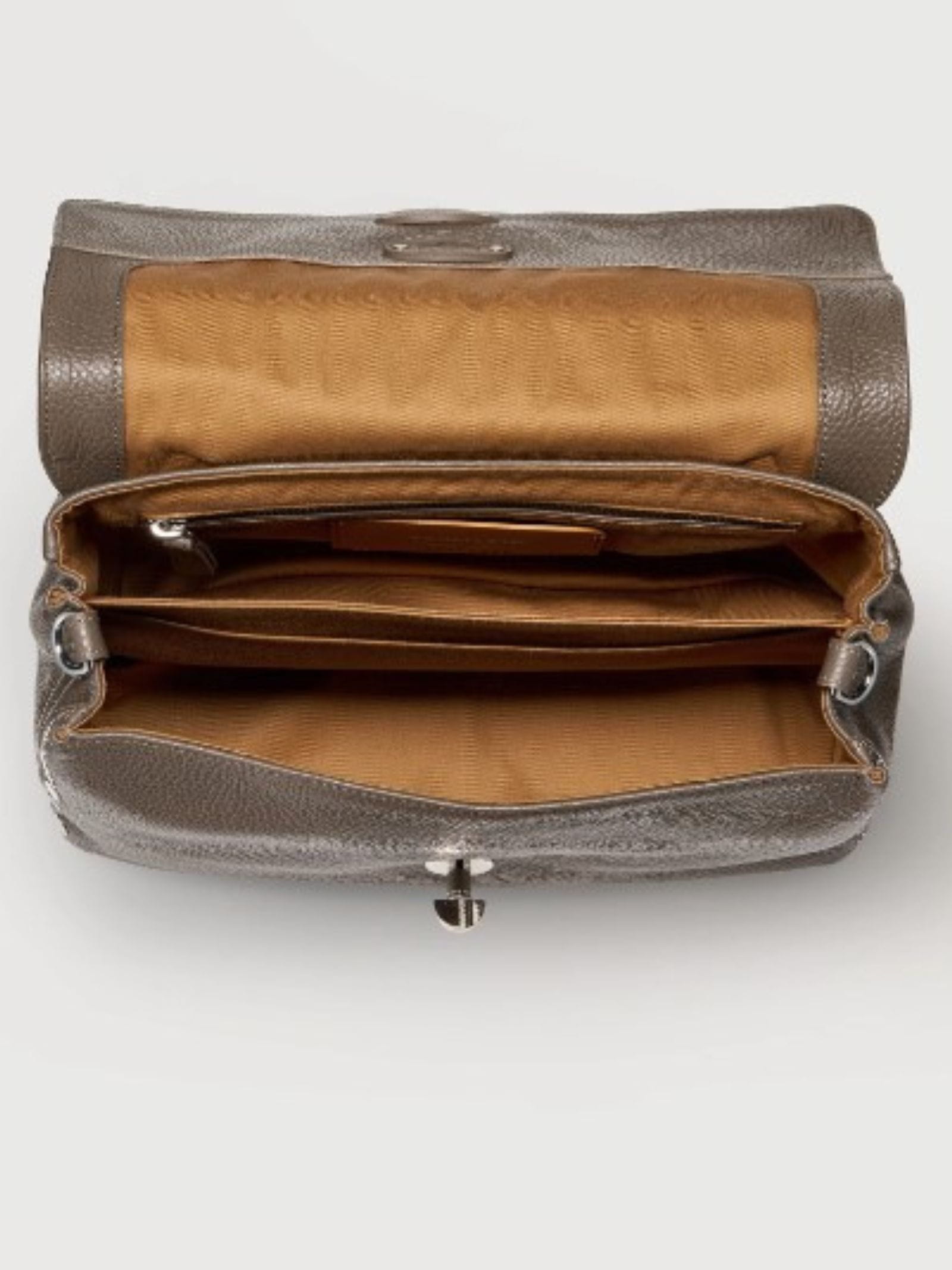Postina in pelle martellata, interno in cotone, doppia chiusura iconica del brand, tracolla regolabile e removibile.