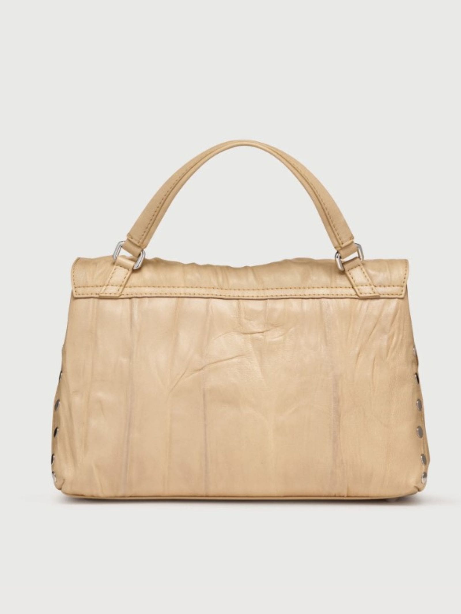 Postina in pelle vegetale ovina, fodera in cotone, doppia chiusura a girello, tracolla regolabile e removibile.
